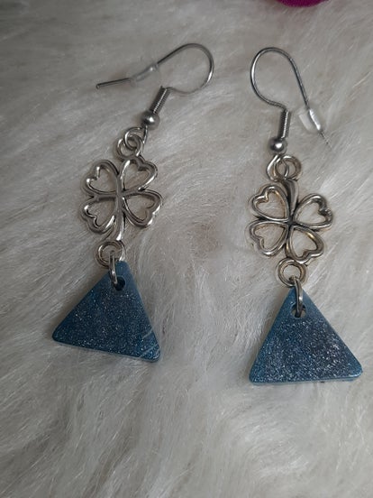 Boucles d'oreilles faites mains en modèle unique , composées d'un petit triangle en resine dans des tons bleus et d'un trèfle argenté montées sur crochets en acier argentés
