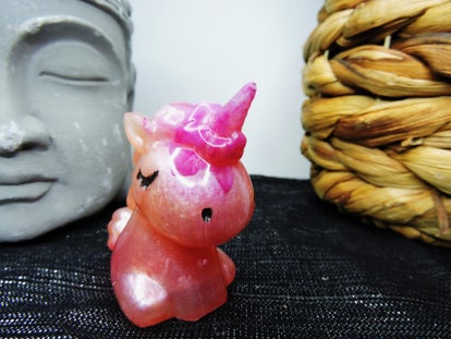 licorne assise en résine , petit modèle , rose avec corne plus foncée