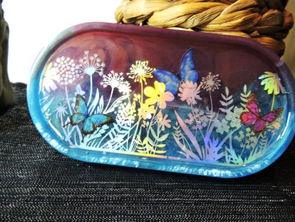 plateau /vide poches en résine , motifs de fleurs argentées et papillon rose et bleus sur un fond bleu et violet