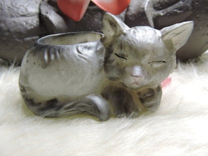 Photophore / porte bougie chat gris et blanc avec noeud rose