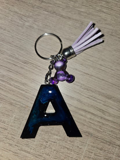 porte clés lettre A en résine , dans des tons bleus et noir complétée par un ourson en résine violet et une pampille lilas
