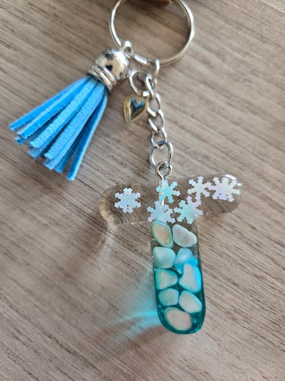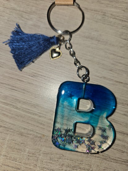 porte clés lettre B en résine , bleu et transparente avec paillètes argentées complétée par une breloque coeur doré et une pampille bleue
