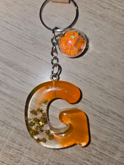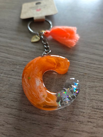 porte clés lettre c en résine , orange et transparente avec paillètes argentées complétée par une breloque coeur doré et une pampille orange