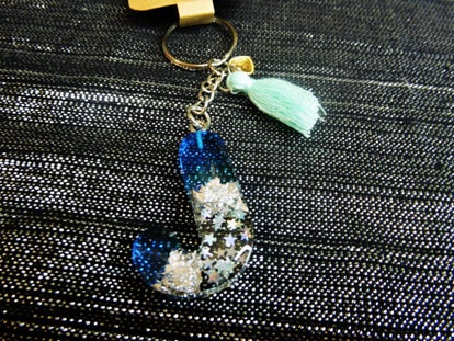 porte clés lettre O en résine , bleue à paillètes argentés complétée par une breloque étoile argentée et une pampille marron claire