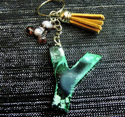 porte clés lettre Y en résine , dans des tons verts complétée par un ourson en résine et une pampille caramel