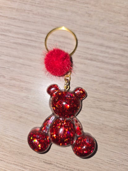 Porte clés ourson transparent avec coeurs dorés intégrés+ petit coeur rouge +pampille rouge/bordeau