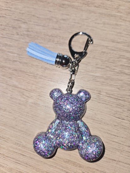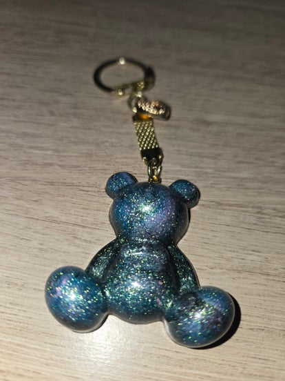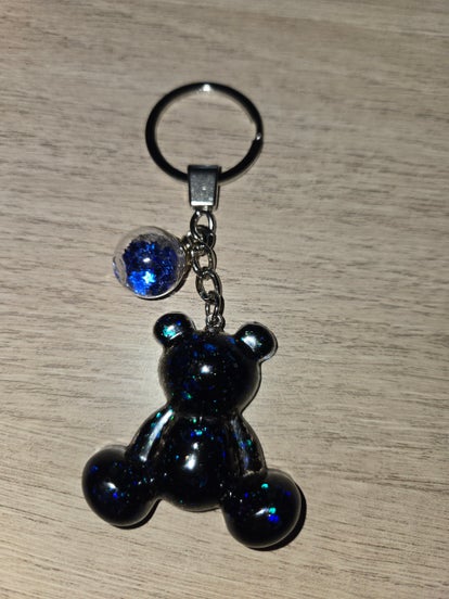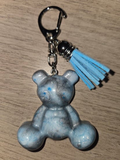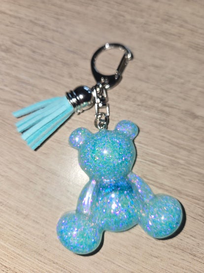 porte clés ours en résine bleu métallisé + ourson en résine nuance de bleu + petit coeur en résine bleu clair et blanc