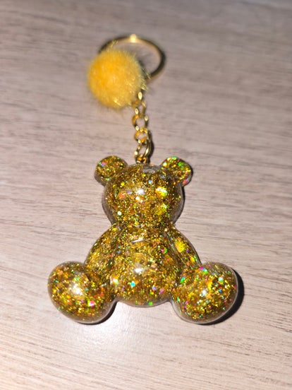 Porte clés ourson transparent avec feuilles d'or intégrées + breloque coeur doré +pampille blanche