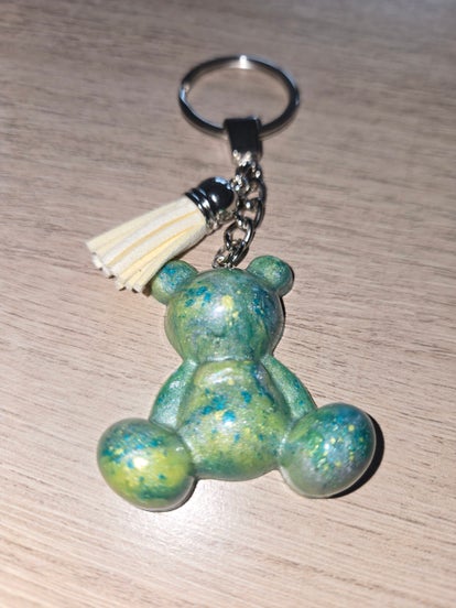 porte clés ours en résine vert métallisé + ourson en résine vert emeraude et blanc + pompom vert