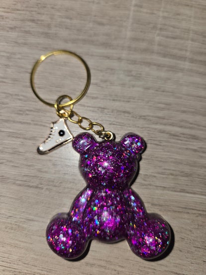 Porte clés ourson transparent avec paillètes étoiles dorées + breloque coeur doré +pampille violette