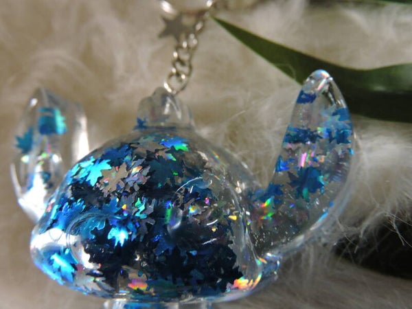 Porte clés Stich transparent avec confettis feuilles bleus et argentés intégrés + pampille + breloque