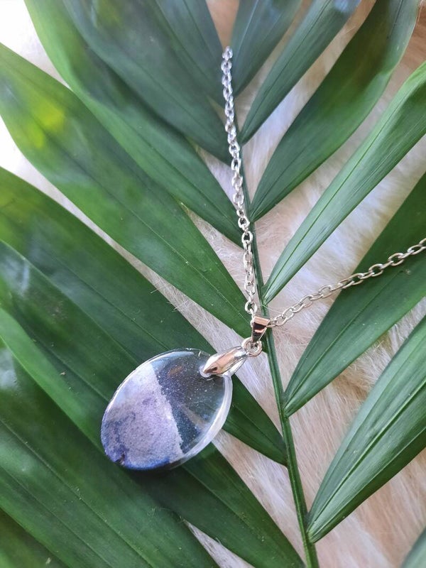 Collier pendentif goutte transparent / violet et blanc + chaîne argentée