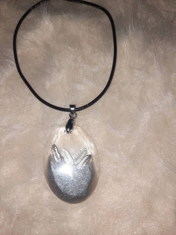 Collier avec pendentif argent / transparent avec plumes argentées intégrées + cordon cuir