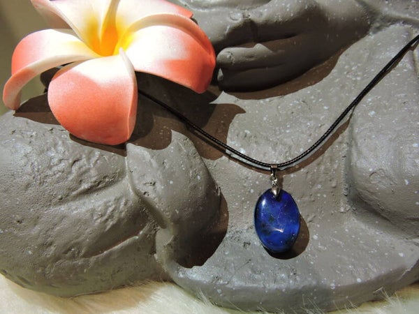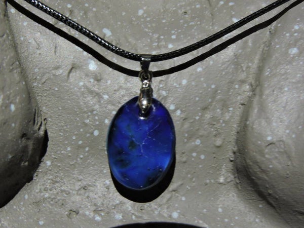 collier avec pendentif ovale avec effets dans les tons bleu + cordon cuir