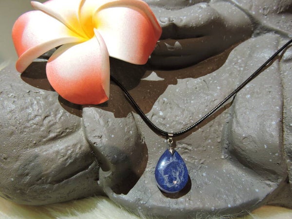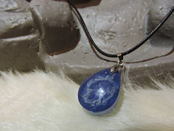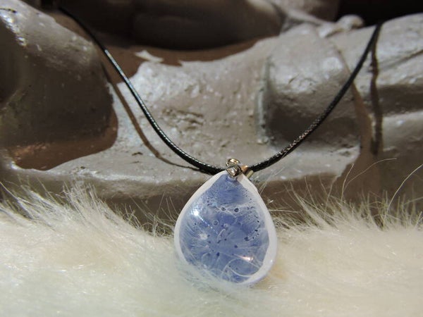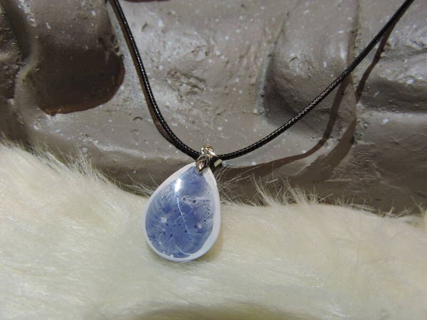 collier avec pendentif goutte fond bleu avec effet de blanc ( possibilité d'être porté des 2 faces ) + cordon cuir