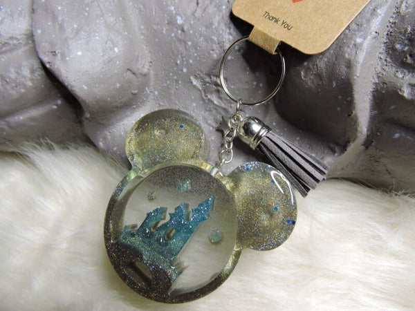 Porte clès en résine epoxy en forme de tête de Mickey avec chateau en relief bleu pailleté et vert / doré , avec quelques pailettes bleues incrustées +petite breloque étoile + pampille grise