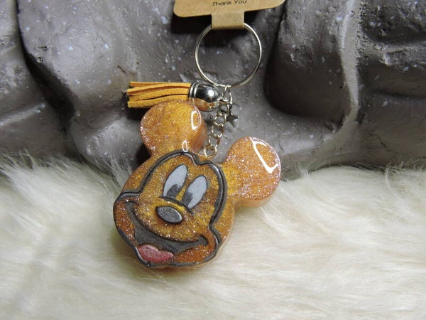 Porte clès en résine epoxy en forme de tête de Mickey orange pailleté +petite breloque étoile argentée + pampille orange