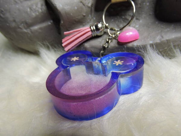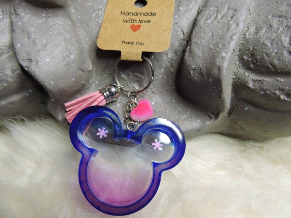 Porte clès en résine epoxy en forme de tête de Mickey fushia et bleu+petit coeur en resine rose et blanc +pampille rose