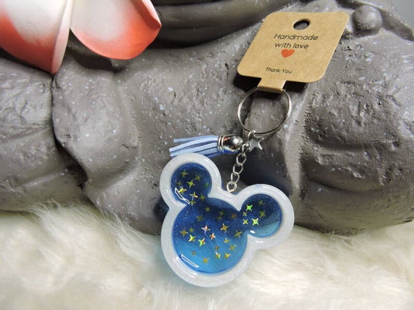 Porte clès en résine epoxy en forme de tête de Mickey bleu et blanc avec etoiles dorées incrustées +petite breloque étoile argentée +pampille bleue clair