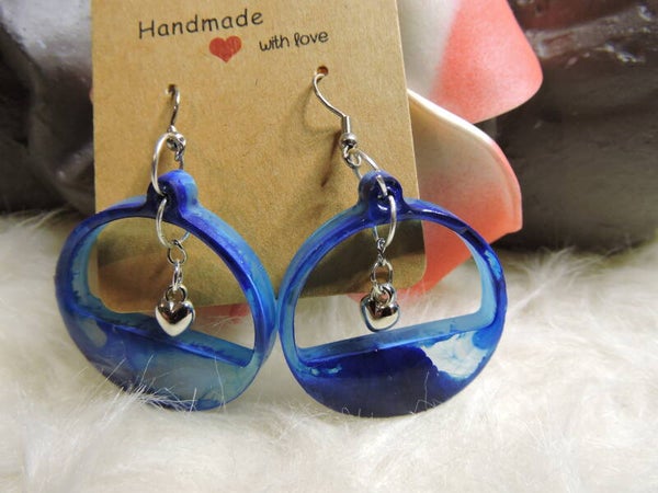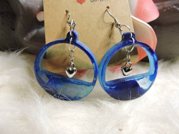 Boucles d'oreilles bleues nuancées avec coeur argenté suspendu sur crochet en acier