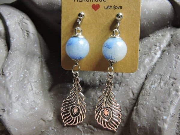 Boucles d'oreilles composées d'une boule en resine epoxy bleue et blanche avec une plume de paon argentée suspendue montée sur clou argenté