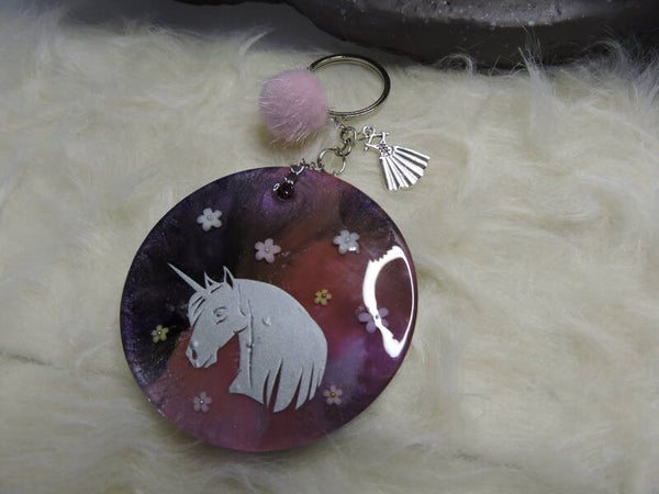 porte clés rond violet et rose avec licorne argentée et petites fleurs + breloque robe + pompom rose clair