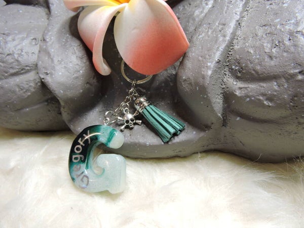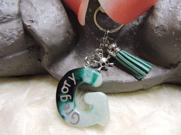 Porte clés en forme de G vert et blanc avec inscription "Gregory" en argenté + breloque crane/ tête de mort + pampille verte