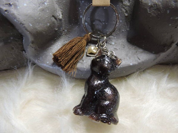 Porte clés en forme de chat marron foncé + breloque coeur doré + pampille marron