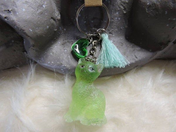 Porte clés en forme de chat vert translucide legerement pailleté + breloque coeur en résine vert + pampille verte