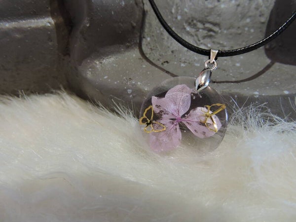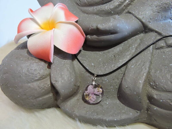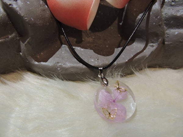 Collier en forme de rond avec fleur rose + papillons dorés integrés + cordon noir