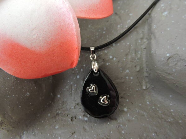 Collier en forme de goutte noir avec 2 coeurs argentés intégrés + cordon noir
