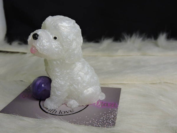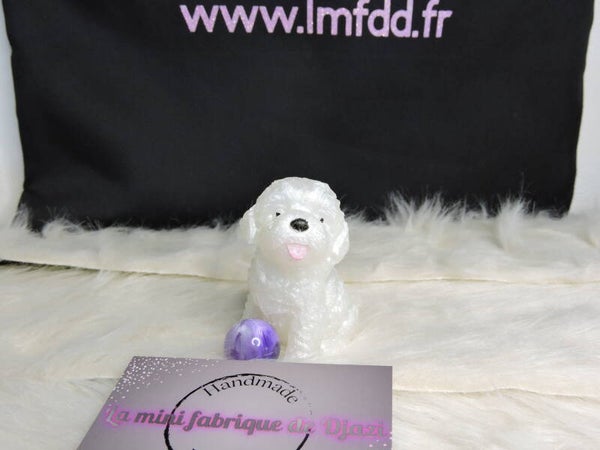 Chien caniche de couleur blanc avec sa balle mauve en résine epoxy fait mains