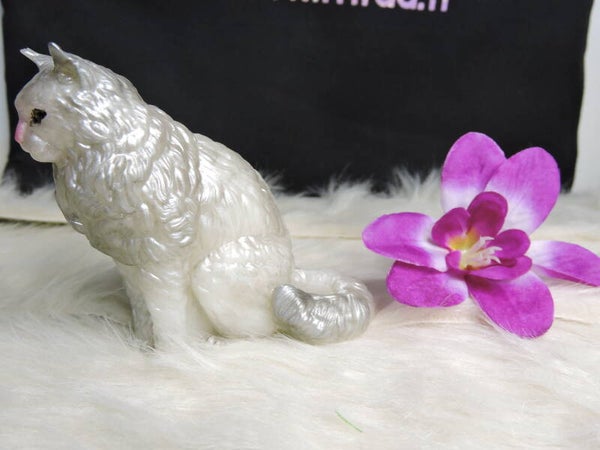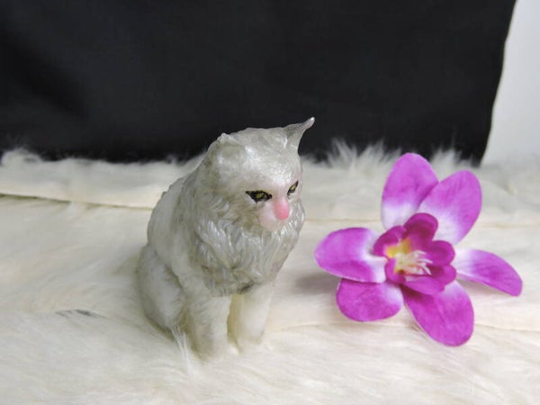 Chat maine coon de couleur blanc et gris argenté en résine epoxy fait mains