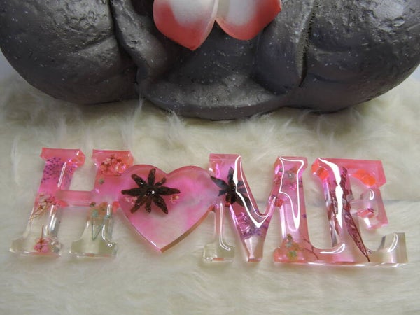 Inscription HOME rose et transparente avec fleurs incrustées en résine fait main
