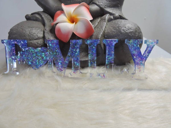 Inscription FAMILY transparente avec feuilles de paillettes holographe en résine fait main