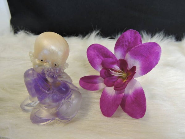 petit moine rieur champagne clair et transparent avec fleur violette intégrée, en résine