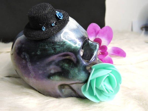 skull / tête de mort en résine couleur caméléon / bleu lilas et blanc avec chapeau noir et rose en mousse vert d'eau