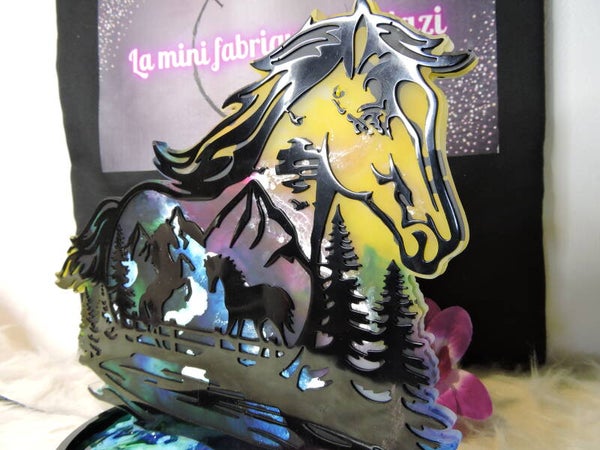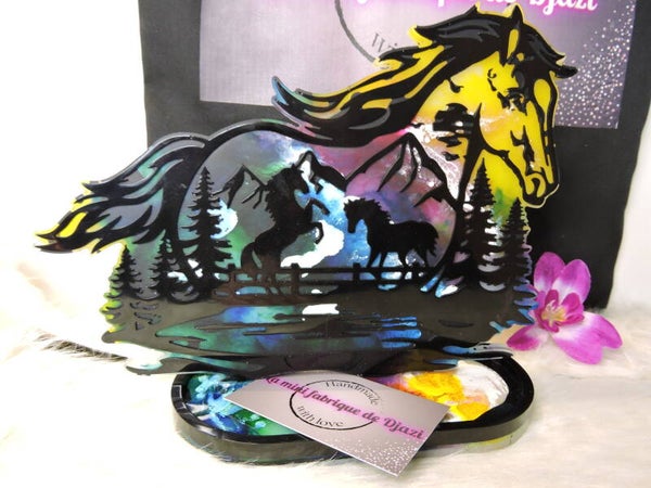 silhouette cheval avec décor interieur noir sur fond multicolore avec socle