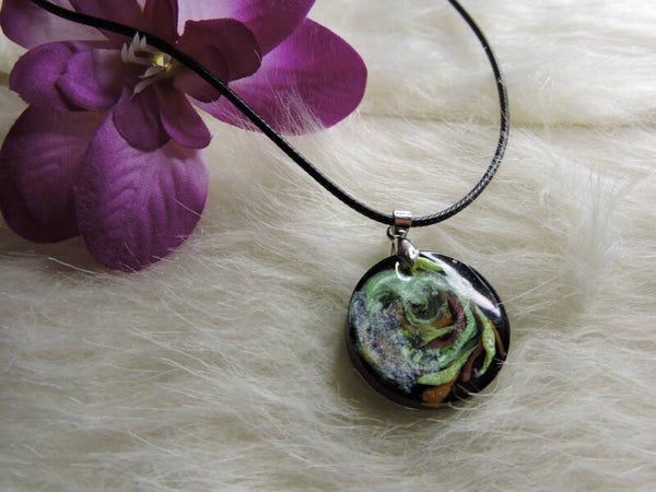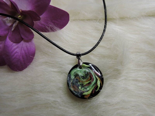 collier avec pendentif rond avec des effets jaune , rouge, orange et vert fluo sur fond noir en résine sur cordon noir
