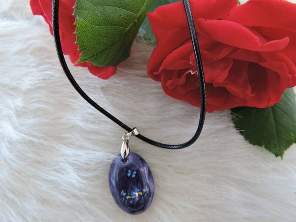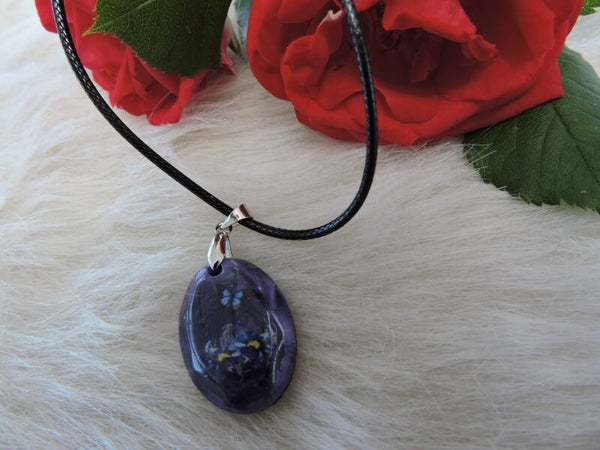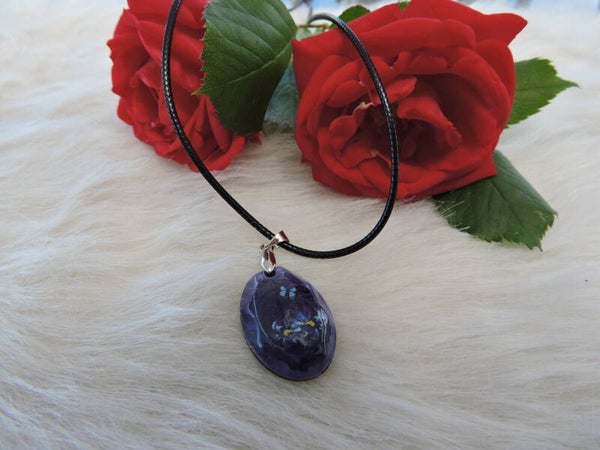 collier avec pendentif oval avec motifs fleurs et papillon dans les tons bleus et jaunes sur fond violet clair et violet foncé en résine + cordon noir