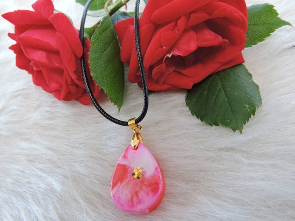 collier avec pendentif en forme de goutte motif effet fleur sur nuances de rose / blanc et doré en résine + cordon noir