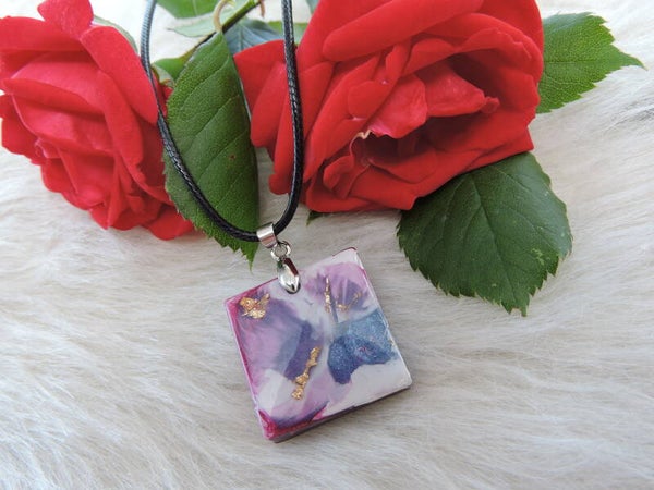 collier avec pendentif carré effet fleur blanc, rose,violet, bleu et doré en résine + cordon noir