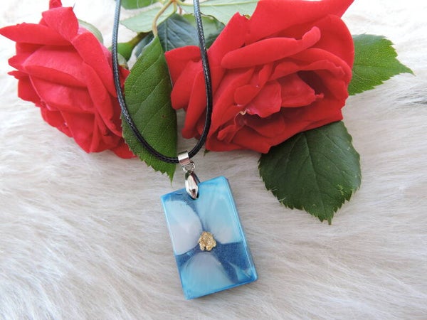 collier pendentif rectangle avec effet de fleur dans des nuances de bleu et doré + cordon noir
