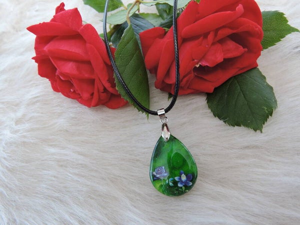 collier avec pendentif en forme de goutte avec motifs fleurs bleues sur fond vert +cordon noir