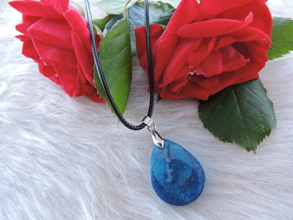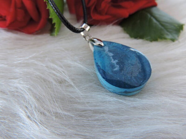 collier pendentif goutte avec des nuances de bleu en résine + cordon noir