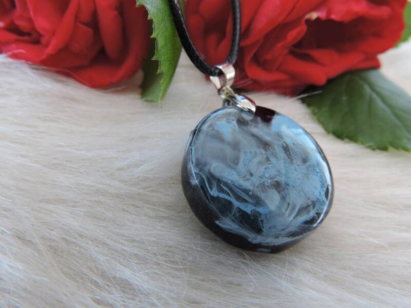 collier pendentif rond en résine avec effets bleutés sur fond noir + cordon noir