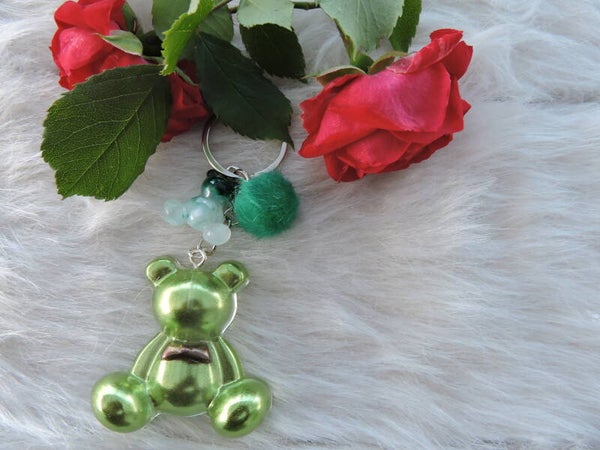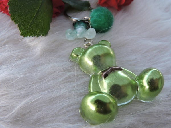 porte clés ours en résine vert métallisé + ourson en résine vert emeraude et blanc + pompom vert