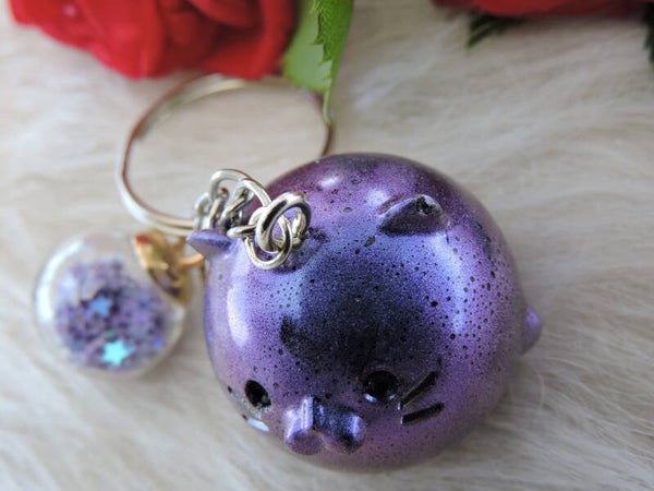 porte clés "z'animobulle" chat bleu/violet caméléon en résine +petite boule en verre avec confettis etoiles mauve