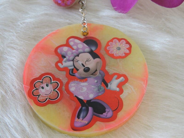 porte clés rond en résine rose fluo et jaune avec motif minnie et fleurs +boule en verre avec confettis étoiles rose/ rouge