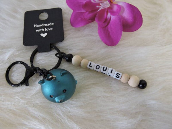 "z'animobulle " en résine ours vert métallisé mat + tige prénom "LOUIS " (peut etre changé max 7 lettres ) avec perles en bois + petit mousqueton